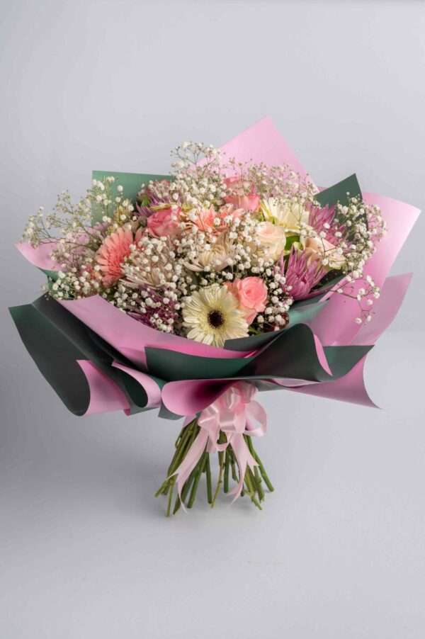Roses are pink, Gerberas are white, and your loved one will find this bouquet a special delight. Impress your significant other with our beautiful mixture of Gerberas, pink Revival Roses, purple Chrysanthemums, and Gypsophila.
