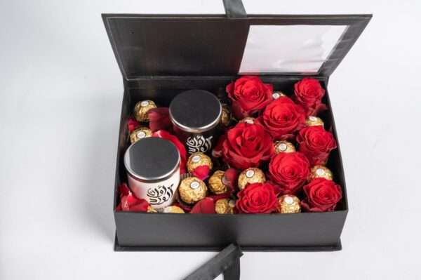 Red roses transmit deep love and passion. Express your love by gifting this box of Everard roses, Ferrero Rocher chocolate, and Awan el Ward’s signature scented candles.